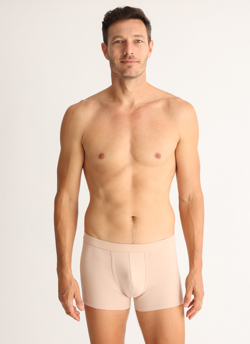 Muške bokserice u boji kože izrađene su od pima pamuka koji je jedna od najfinijih vrsta pamuka na svetu. Ova tkanina je svilenkasta na dodir, ne gužva se lako i duže traje. Bokserice imaju lastiš sa ispisom.
